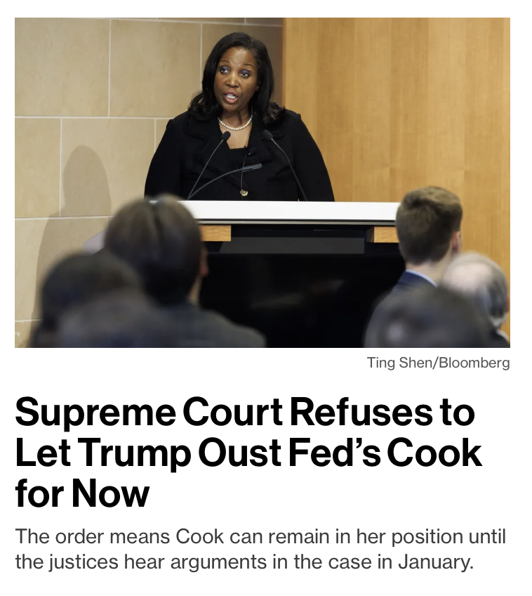 Supreme Court blocks Trump’s attempt to remove Fed Governor Lisa Cook. She’ll remain in her role until the case is argued in January.Shared via