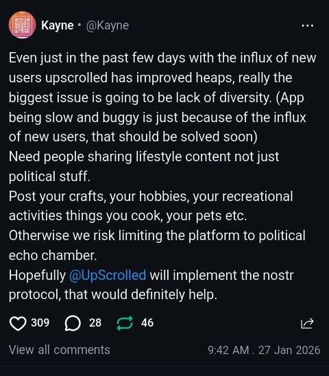 I'm doing my part to purple pill upscrolled, but even if it doesn't work I'll probably stay on there, i get far more interaction from people on upscrolled than I get here already.