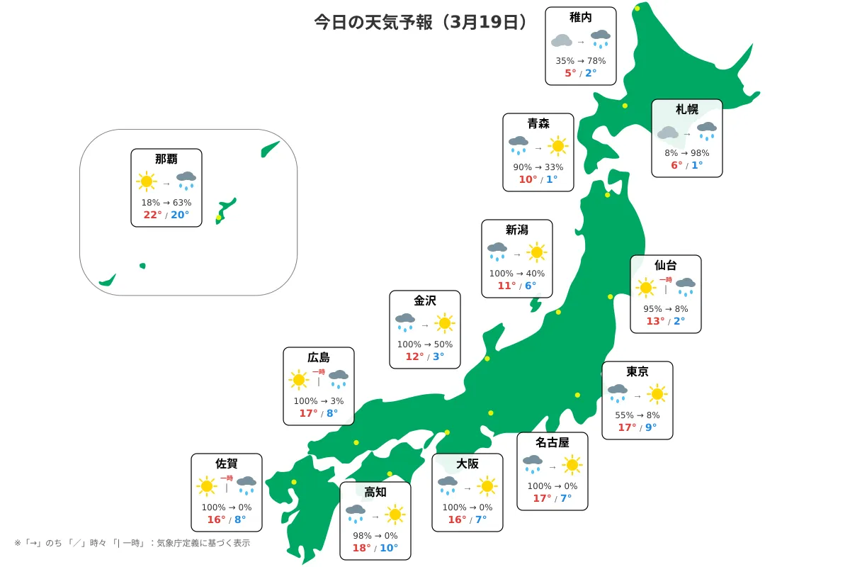今日の天気予報(3月19日)各地域の午前/午後の降水確率と最高/最低気温を表示しています。https://share.yabu.me/3828b339214c8a5333b2414c9068cd10c929240af0c37bc973be7d5ccde90211/1594f768ea635ced293abd43066f6bd0495a9b9804f94a426127cd87df9dccd5.webp
